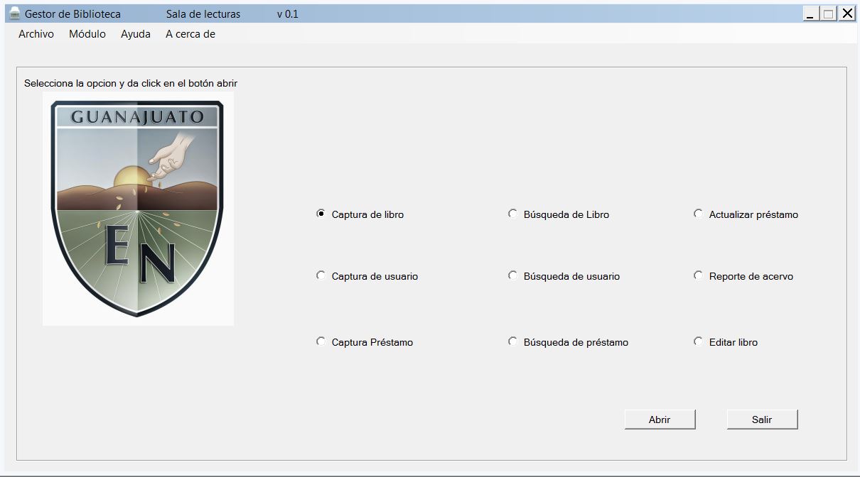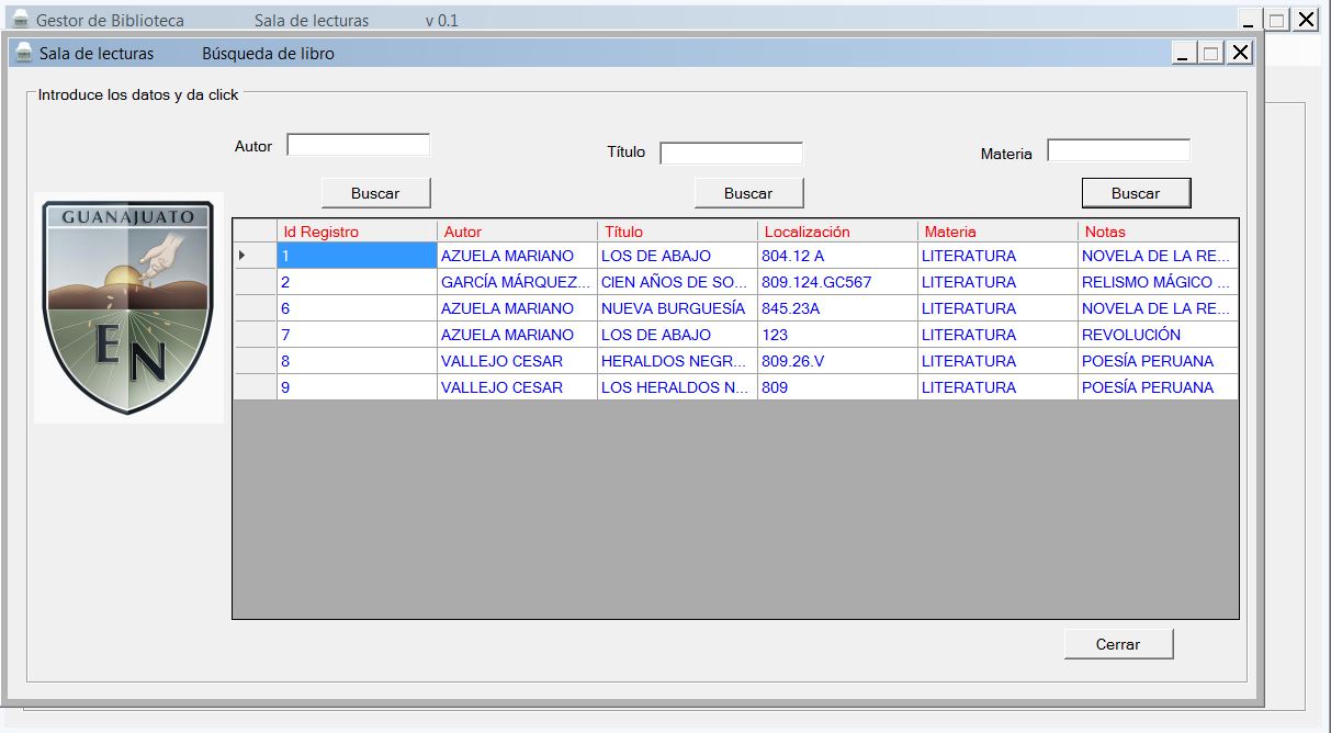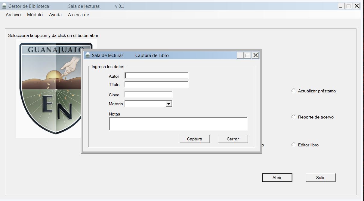 Programa Gestor de Biblioteca para la sala de lectura de la BCENOG. El programa es para el sistema operativo Windows y permitirá próximamente a los estudiantes la consulta digital por autor, título y materia del acervo bibliográfico en la sala de lectura.